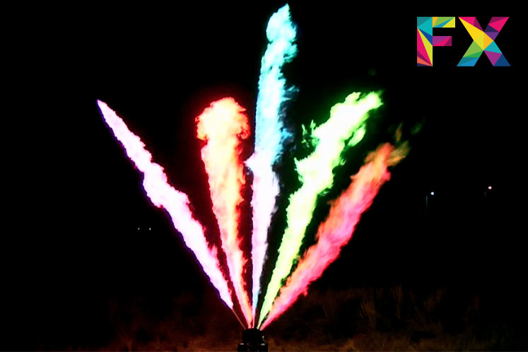 De los efectos más impactantes para el público, flamas en 5 diferentes colores (rojo, azul, amarillo, verde y lila) que alcanza una altura de 9 metros y son ideales para proyectos donde se busca sorprender y emocionar al público.